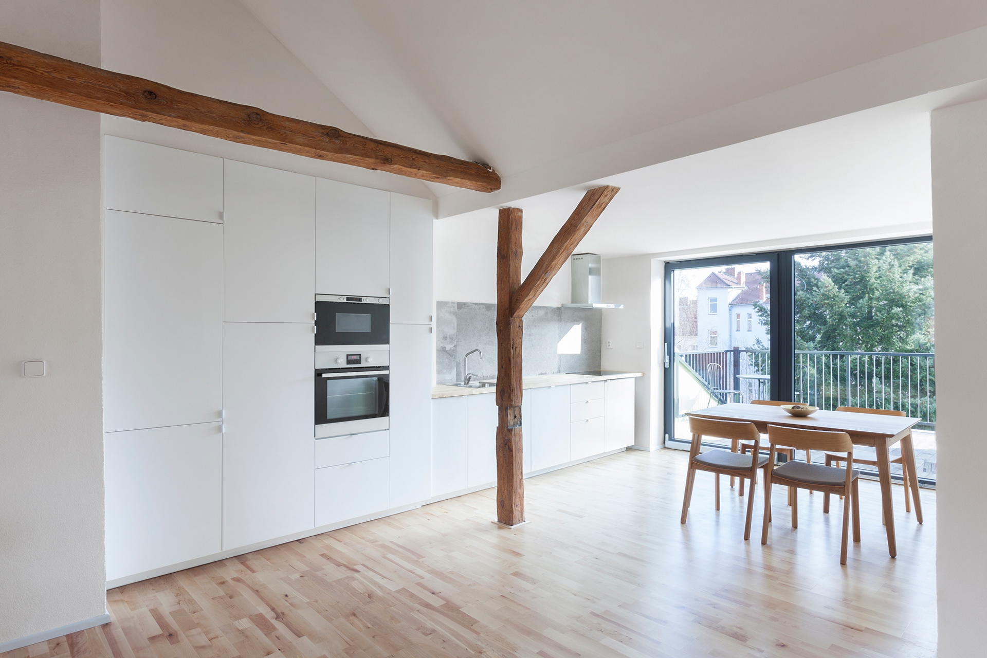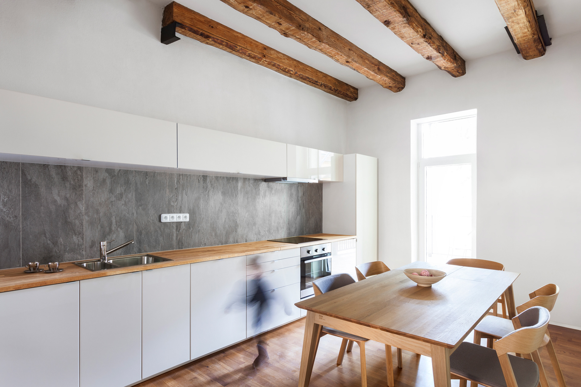 V bytovém domě se nachází celkem 5 různorodých bytových jednotek. V prvním vstupním patře jsou bytové jednotky dvě, dělené vstupní chodbou. Obě dvě jsou řešeny jako 2+kk o obytné ploše 46 m2 a 34 m2 s terasou a možností přikoupení části zahrady v klidném vnitrobloku. V druhém a třetím patře se nacházejí identické jednotky. Obě jsou řešeny jako 3+kk o obytné ploše 93 m2 (byt je umístěn vždy přes celé patro). V podkroví se pak nachází půdní byt o obytné ploše 128 m2 se specificky řešenou dispozicí, vysokými stropy a velkorysými okny s krásným výhledem. Součástí bytů je rozlehlá terasa orientována do vnitrobloku o ploše 12 m2 a studená uzamykatelná komora na patrech v domovní chodbě. Ke všem bytům taktéž náleží prostorné sklepy (od 8 do 18 m2) v prvním podzemním podlaží.