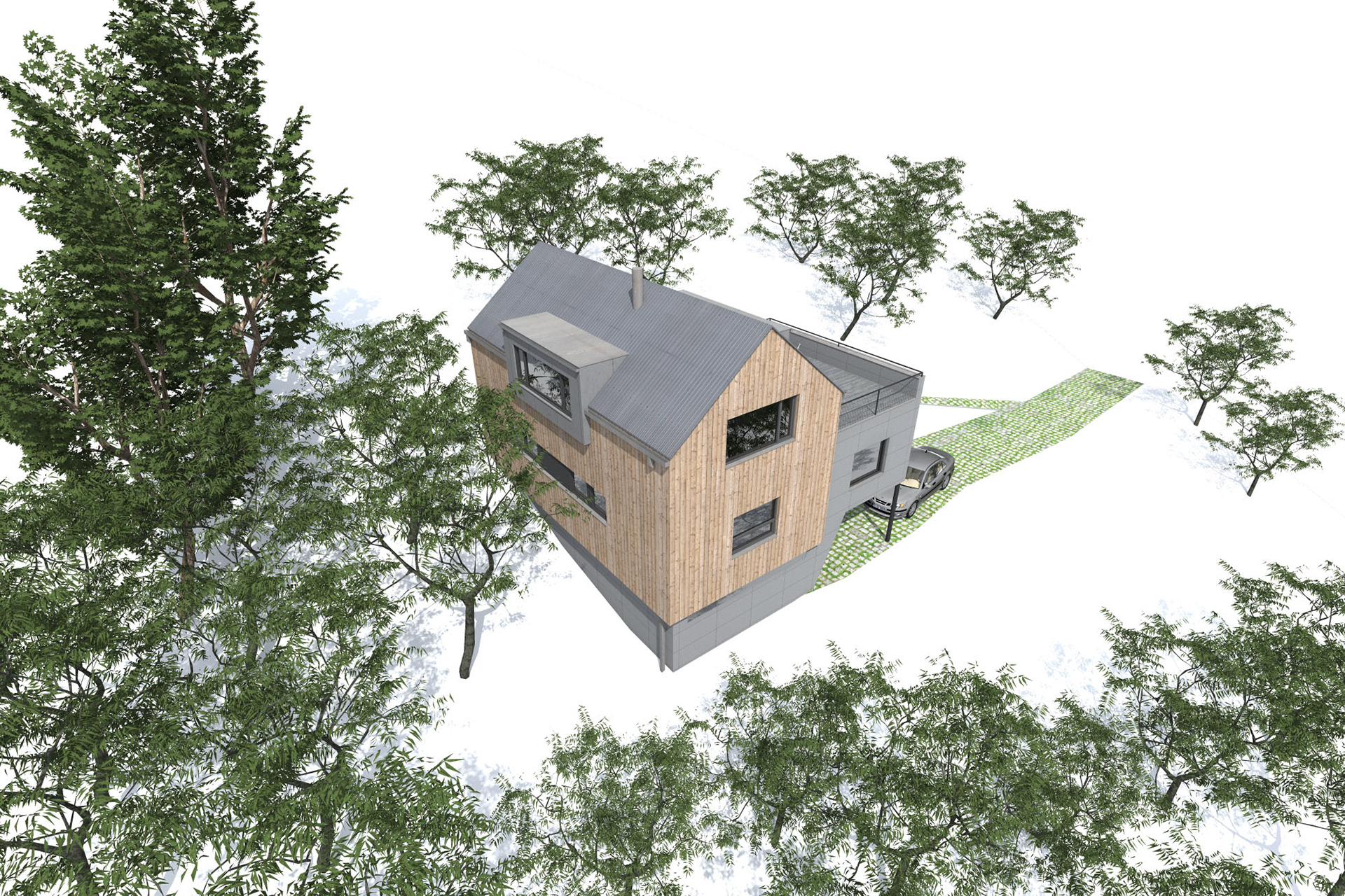 První, severní umístění je objekt dvojdomu (rekonstrukce stávajícího skladového objektu), kdy objekt je umístěn do svahu terénu a část terénu je do něj opřena resp. do jeho severní fasády. Objekt dvojdomu je vertikálně dělen na dvě části. K východní části dvojdomu přísluší jednak východní část zahrady nad komunikací a jednak část jižní zahrady nad komunikací. Západní část dvojdomu (větší část z dvojdomu) má k dispozici jižní rovinatou část zahrady a západní příkřejší část zahrady. Vstup do objektu je od jihu. Parkování u dvojdomu je jednak na vlastních pozemcích a jednak na komunikaci (dohromady má dvojdům 4 parkovací stání, dvě pro každý objekt). Druhé jižní umístění reflektuje původní umístění obytného objektu na hranici opěrné zdi, nicméně vzhledem k nutnosti rozšíření přístupové komunikace se objekt posouvá na opěrnou zeď, která se tak stává i jeho základem. Objekty jsou pak vyvýšeny nad vlastní zahradou, která bude přístupná ze schodů přimknutých k samotné opěrné zdi.